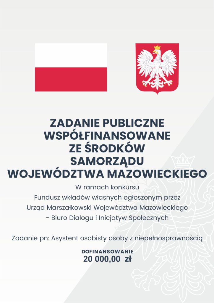 Zadanie realizowane przez COLOR Spółdzielnię Socjalną w ramach dofinansowania ze środków Państwowego Funduszu Celowego Fundusz Solidarnościowy „Asystent Osobisty Osoby z Niepełnosprawnością” dla Organizacji Pozarządowych – edycja 2025. Finansowanie w kwocie 1 166 378, 84 zł. Całkowita wartość 1 189 878, 84 zł, oraz współfinansowania ze środków Samorządu Województwa Mazowieckiego w kwocie 20 000,00 zł.